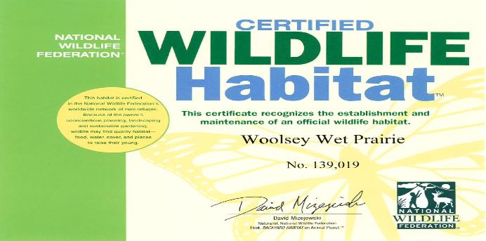 OMI, the company contracted by the City of Fayetteville to operate wastewater facilities, applied to the National Wildlife Federation to get special recognition for Woolsey Wet Prairie. On March 9, 2011, the National Wildlife Federation certified the Woolsey Wet Prairie as a National Wildlife Habitat. |